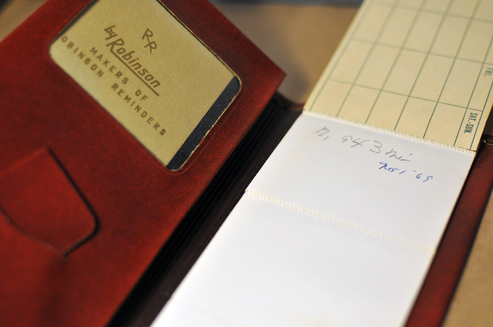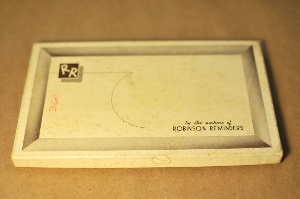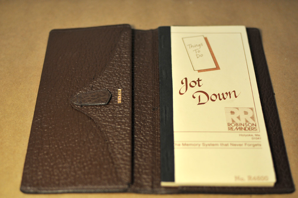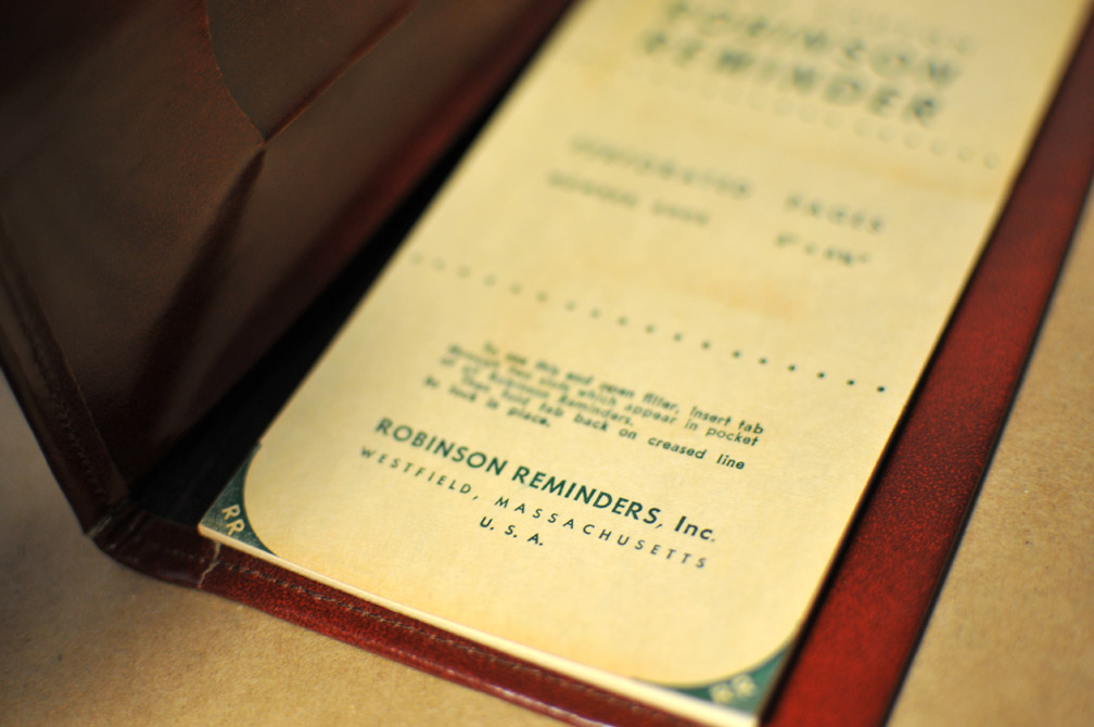 One of my favorite eBay treasure hunts is for Robinson Reminders, originally from Westfield, Mass. The company made little perforated notebooks that go inside specially designed leather holders. The idea with the Robinson Reminder was to write a to-do on a piece of paper and when you were done with that item you tear it out. So only non-completed tasks remain. As far as I can tell, RR was a pretty big company that was around for a long time. Though not anymore. I would be interested to learn more, but the internet hasn’t turned much up for me. Interestingly though, they don’t come up on eBay very often. But when they do I grab them. I’m sure I will have more competition now…