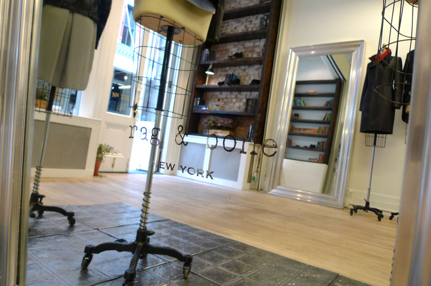 The third Rag & Bone store on Mercer Street is an airy space with high ceilings and a refined industrial feel. At first glance it looks like the other shops on the retail-friendly cobblestone block, but when you get in there and really look closely you will notice well thought out detailing that makes the space special. The lighting looks like something that came out of an old GM factory (or old New York workspace), the rolling racks were treated with acid to give them a nice patina and all of the furniture in the entire space was custom made for Rag & Bone. One specific piece, a massive floor to ceiling mirror framed in welded steel, serves to boggle your clothing focused mind. One other favorite detail was the Rag & Bone embossed buttons that dot the beautiful gray Chesterfield ottoman that is positioned in the rear of the store under slanted metal and glass windows, a light source that are functional hold overs from the building’s days as a dim warehouse. With the new Mercer space the Rag & Bone folks have walked a fine line between having a functional, beautiful and well branded space – something you don’t see everyday.