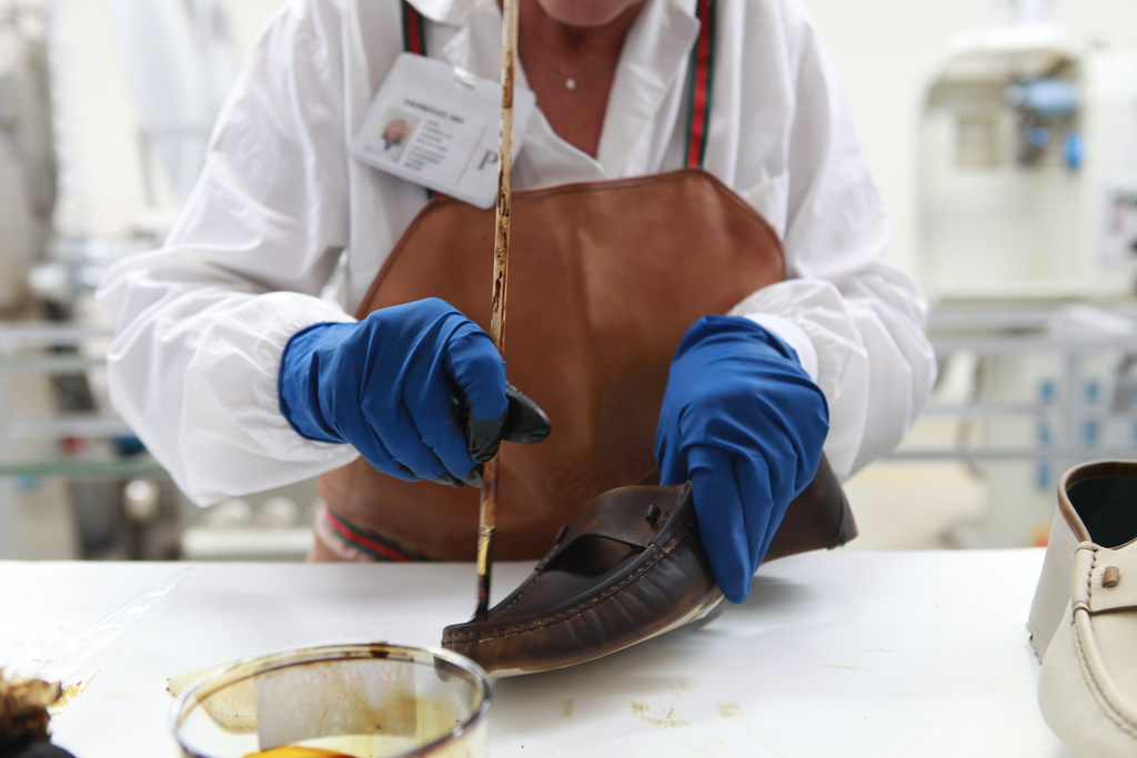 Eventually, the loafers make their way around the room to the welting step and through layers and layers of finishing. This finishing process includes polishing, more hand staining, drying, more polishing and eventually to the craftsman who attaches the classic Gucci “Horsebit” hardware. The finished shoes are then packed up neatly awaiting final delivery to the store or customer. The process of making leather shoes at Gucci is a beautiful one and held in high regard for an obvious reason. The craftspeople in that simple building outside Florence are the unique combination of experience, technology and a historical skill set that has developed over generations. What more could one want in an icon?