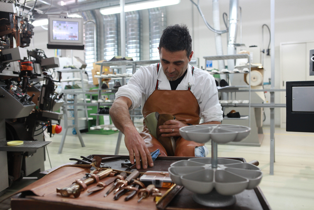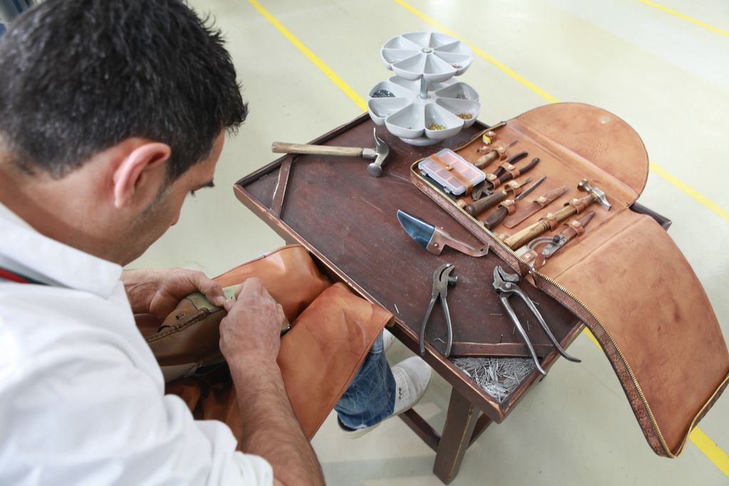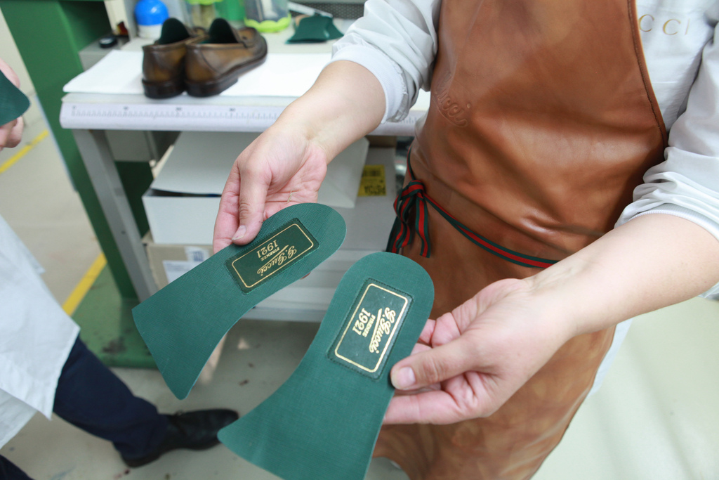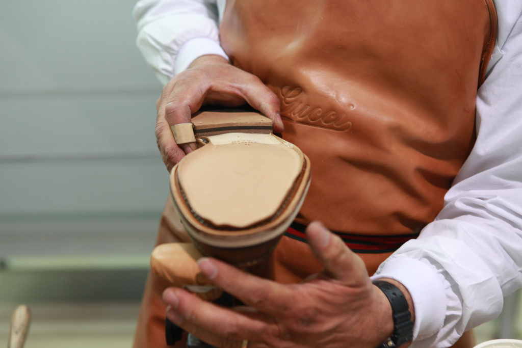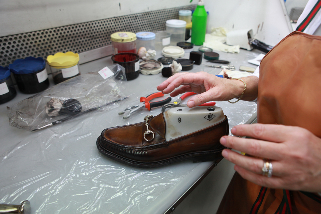 If teleported into the building without any knowledge of the craft that held within those walls, one could reasonably think workers were turning out semiconductors or some other ultra-modern device. The neatly-organized space is bright and clean with machinery clustered sporadically along a looping line. It is the perfect marriage of technology and traditional craft with a seasoned group of shoemakers, sewers and cutters all under one roof. The nexus of old and new world is best exemplified in the attire of the tradespeople themselves; each worker wears a white lab coat with a beautifully tanned leather apron in a charming way that only Italians can pull off. The craftsmen attach the leather loafers to the last by hand with a nail and hammer while sitting on a little wooden stool at a well worn and purpose built work bench. Even the tools have their own Gucci embossed leather kit to keep all necessary instruments organized and at hand. Looking around, I had a vision of what it would have been like for an Italian 1950s me driving my Cinquecento to the factory, grabbing my apron and going to work as a skilled (and humble) craftsman. If Daniel Day Lewis can do it, why not me?