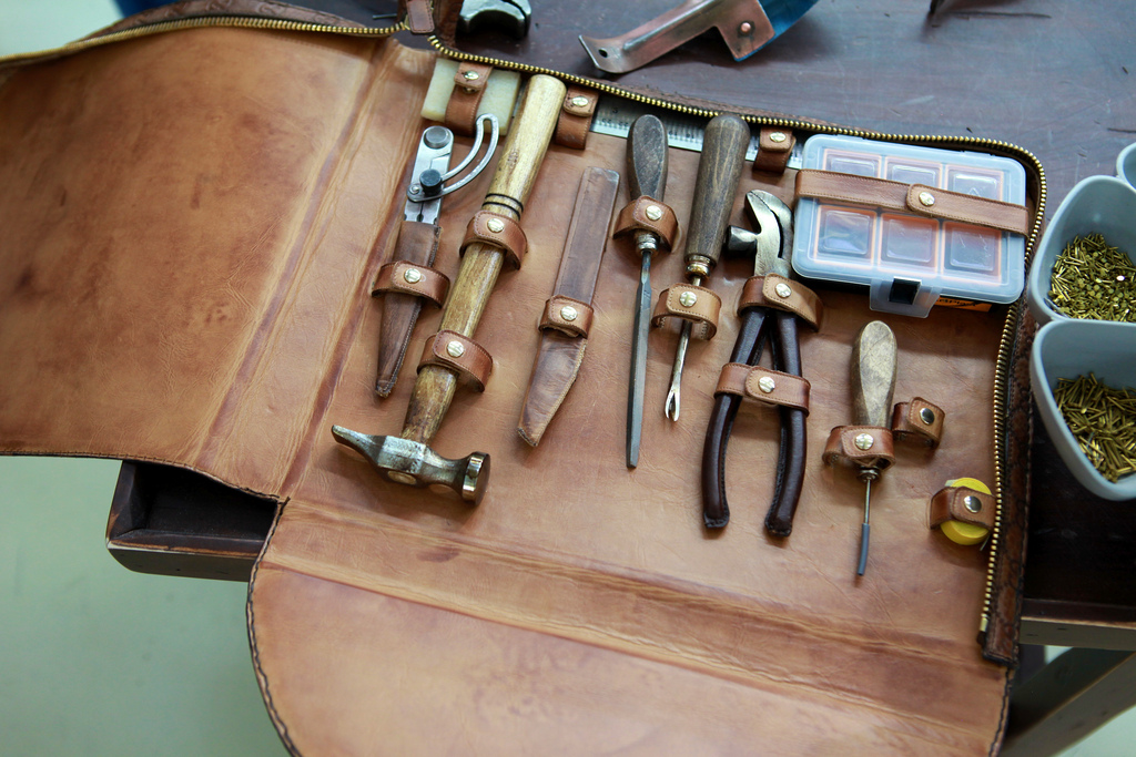 I love the old school cobblers and the leatherworking tools. But how do I snatch up one of those awesome leather Gucci aprons the dude was wearing!