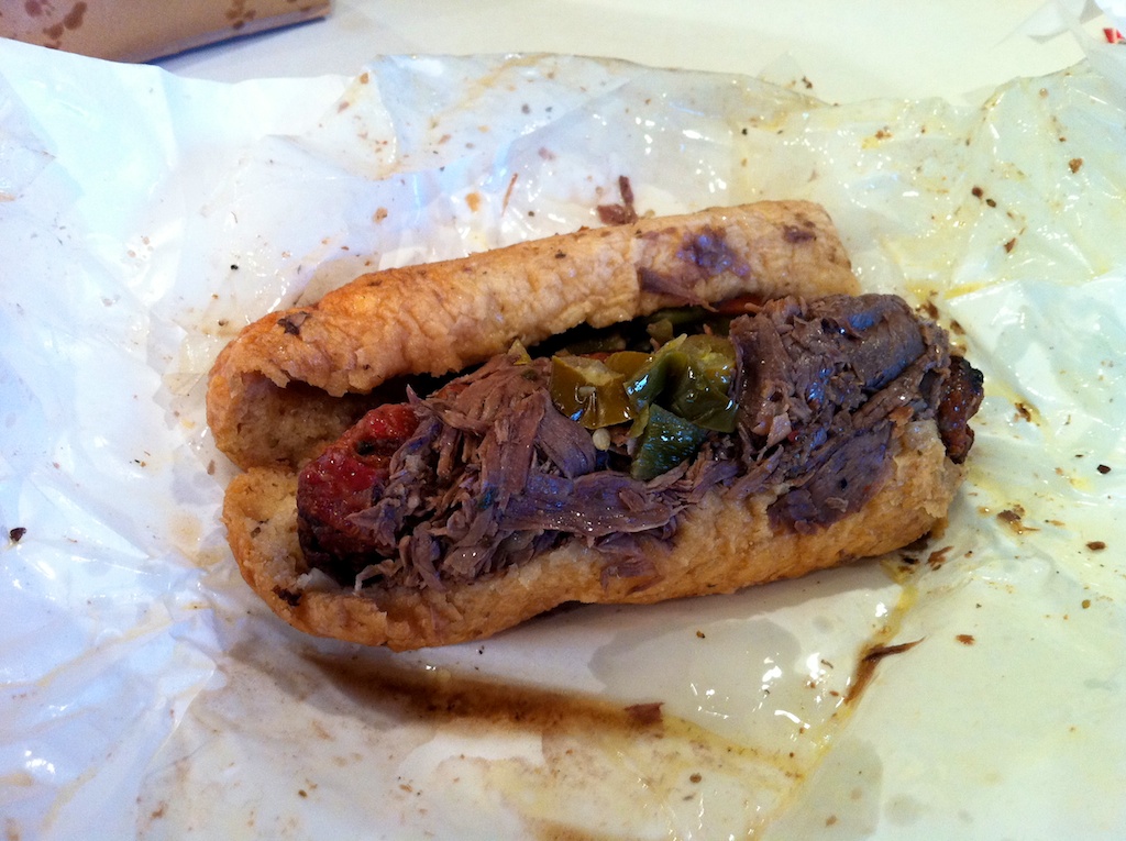 Often eclipsed by the Vienna hot dog in the national sandwich dialogue, the Italian beef is the most famous Chicago sandwich that no one outside the Midwest has ever heard of. After moving to New York, I was shocked to find out that none of my East Coast friends had ever tried a beef. The only way I can explain it to outsiders is by comparing it to a French Dip, although the ingredients in these two sandwiches are similar, the end results are entirely different. The Italian beef at its most basic level uses thinly shaved roast beef that is allowed to soak in its own garlicky, seasoned juices for hours until it has fully absorbed the flavor of the gravy. The beef is then piled inside chewy Italian bread and topped with sweet or hot peppers. Of course, this foundation allows for a number of different sandwich combinations, and every beef stand in the city offers its own flavors and variation on the classic style.